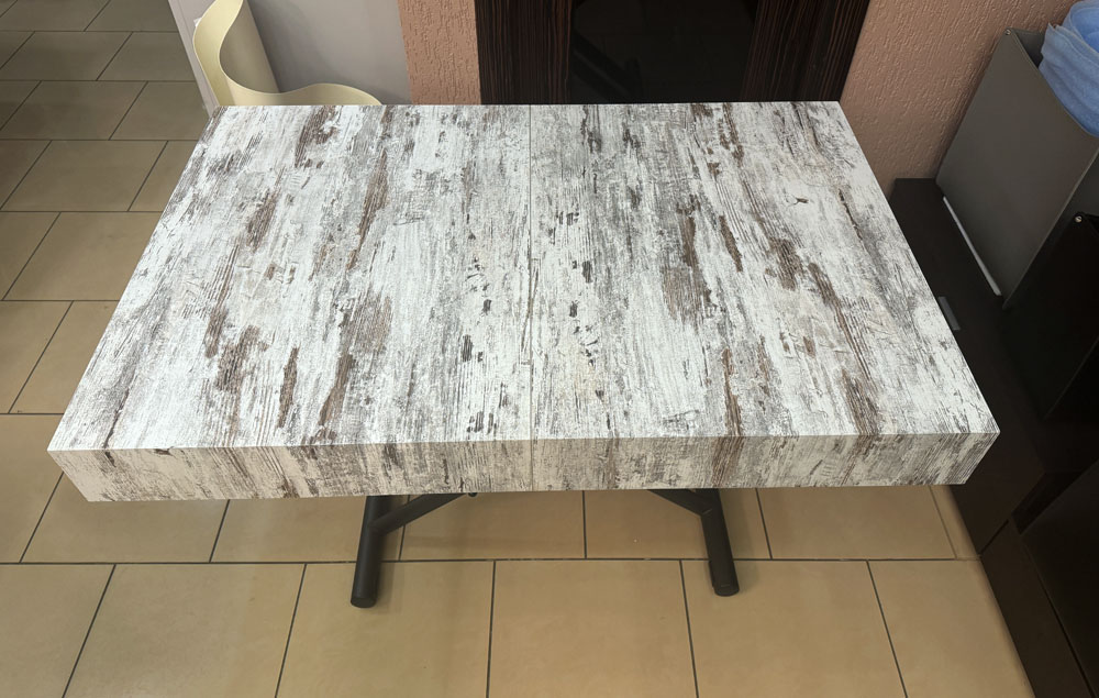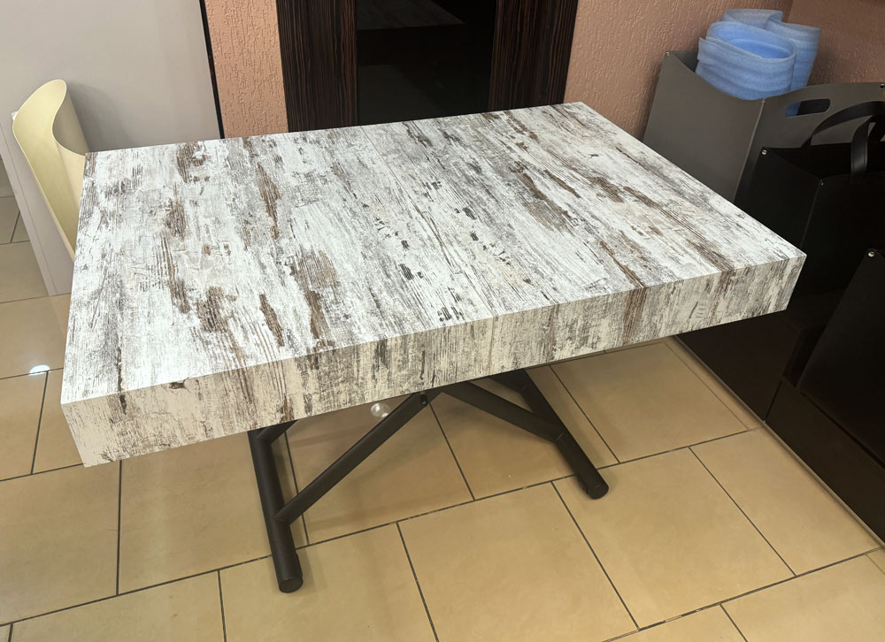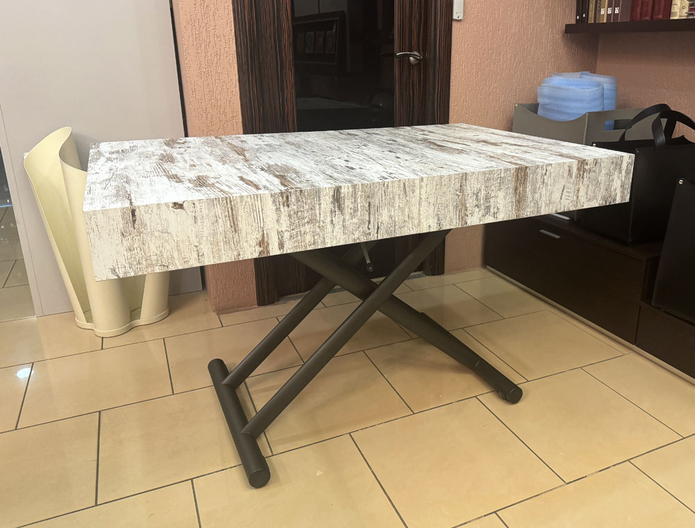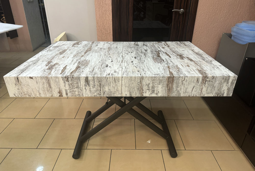Журнальный столик превращается в обеденный стол. Металлическая база, газлифт, регулируемый по высоте с точностью до миллиметра от 28 см до 88 см. Прямоугольная столешница - ламинат, 2 внутренних расширения. Выдвижные колеса.