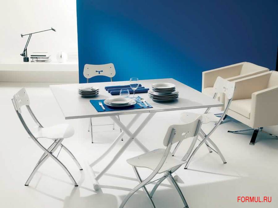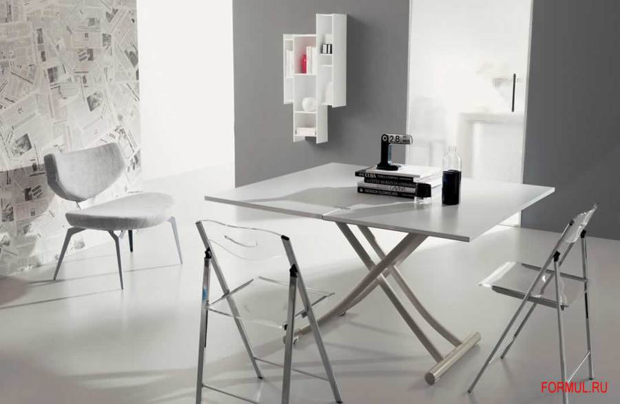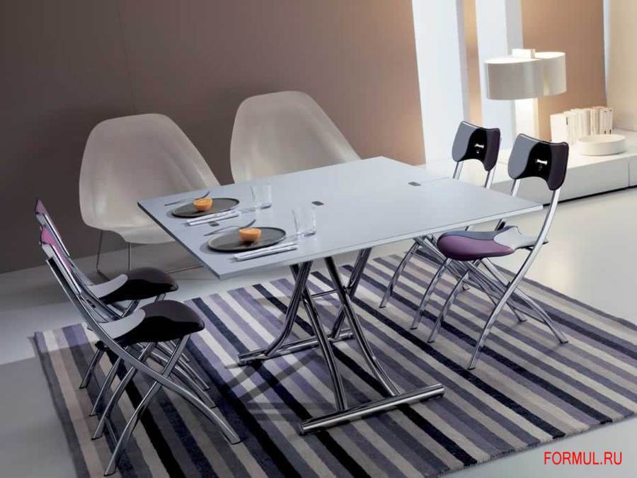 Современный стол – трансформер - оптимальное решение для кухни. Во-первых, он не занимает много места. Во-вторых, его регулируемая высота, конечно же, одно из ценных преимуществ перед обычными обеденными столами. Раскладная столешница и регулятор высоты позволяют с комфортом разместиться за столом не только взрослым – опуская стол, можно удобно расположить за ним детей.