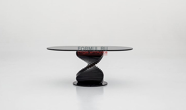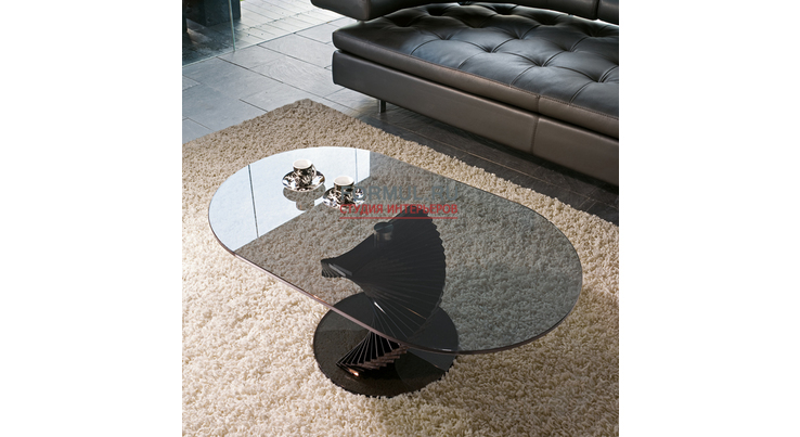 Стеклянный столик с основанием в форме оригинальной спирали. Столешница имеет овальную форму. Столик из серого стекла.