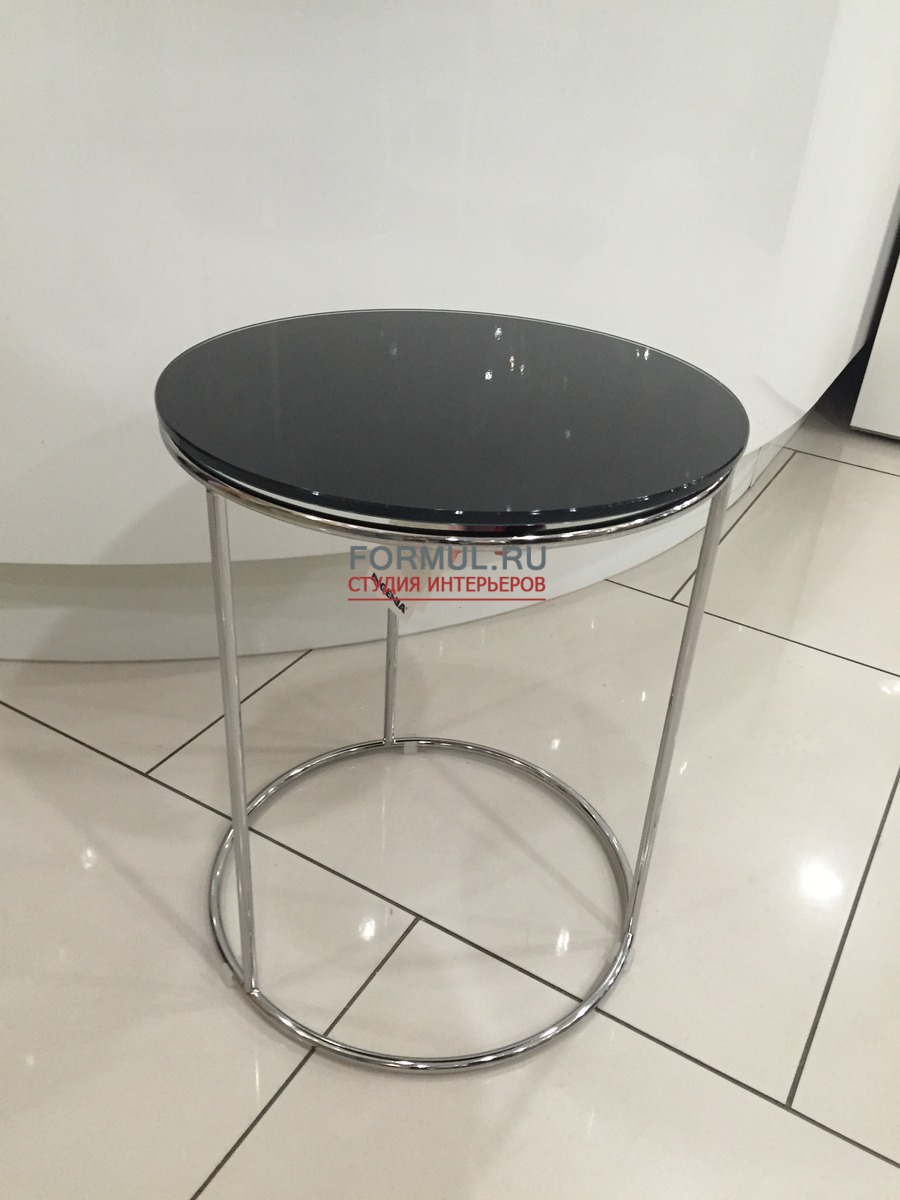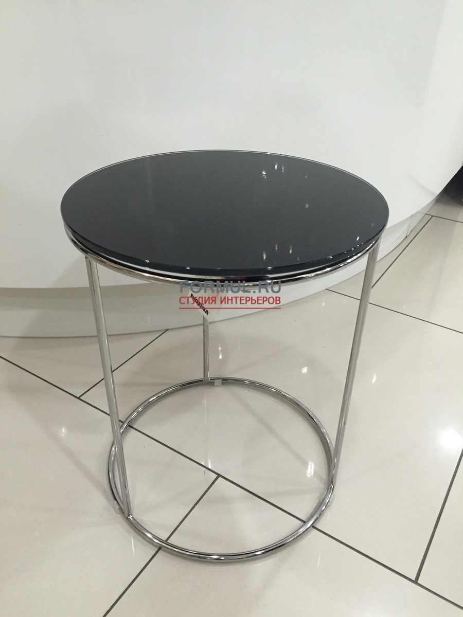 КРУГЛЫЙ ЖУРНАЛЬНЫЙ СТОЛИК С ЧЕРНОЙ СТЕКЛЯННОЙ СТОЛЕШНИЦЕЙ И ХРОМИРОВАННЫМ ОСНОВАНИЕМ.