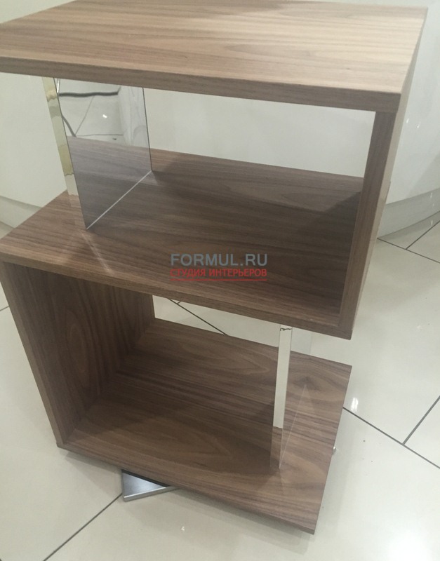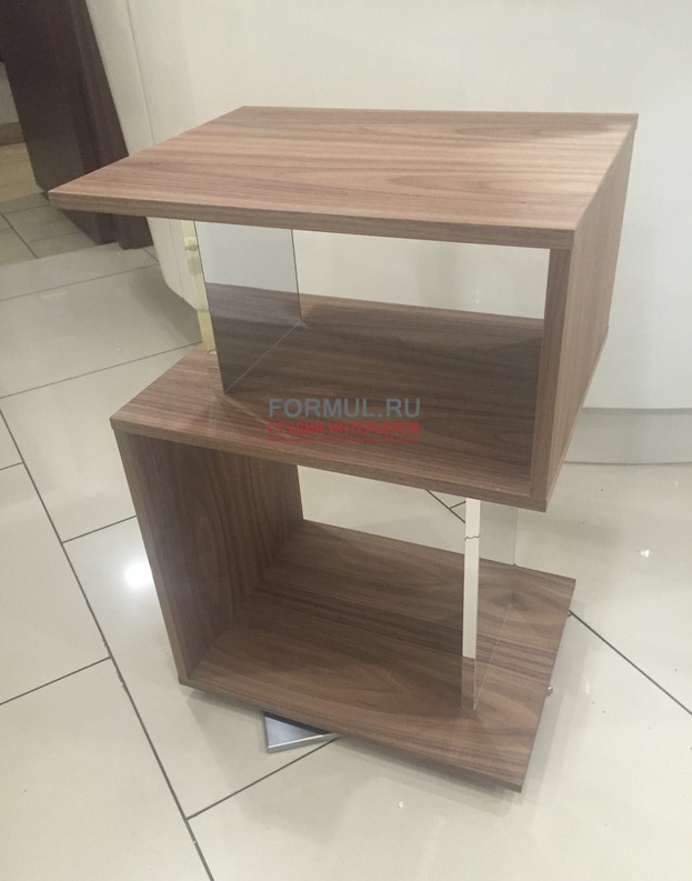Вращающийся столик выполнен из лакированного МДФ и декорирован зеркалом. Он идеален в роли приставного стола, также его можно использовать как небольшой книжный шкаф или стеллаж для хранения различной мелочевки, рамок с фотографиями, предметов декора.