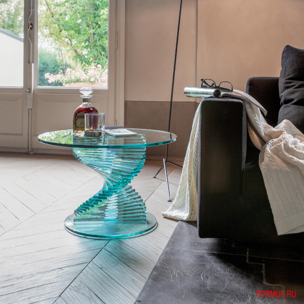 Столик Ariel 6814 фабрики Tonin Casa полностью изготовлен из закаленного прозрачного стекла. Столешница выполнена в виде идеального круга, но главная особенность представленной модели – очень оригинальное спиральное основание. Журнальный столик изготовлен по особой технологии, поэтому он надежно прослужит не один год. Стеклянный столик выглядит как настоящее произведение искусства, как необычная и магнетическая скульптура. Стеклянные элементы создают множество отражений, наполняя интерьер волшебной атмосферой.