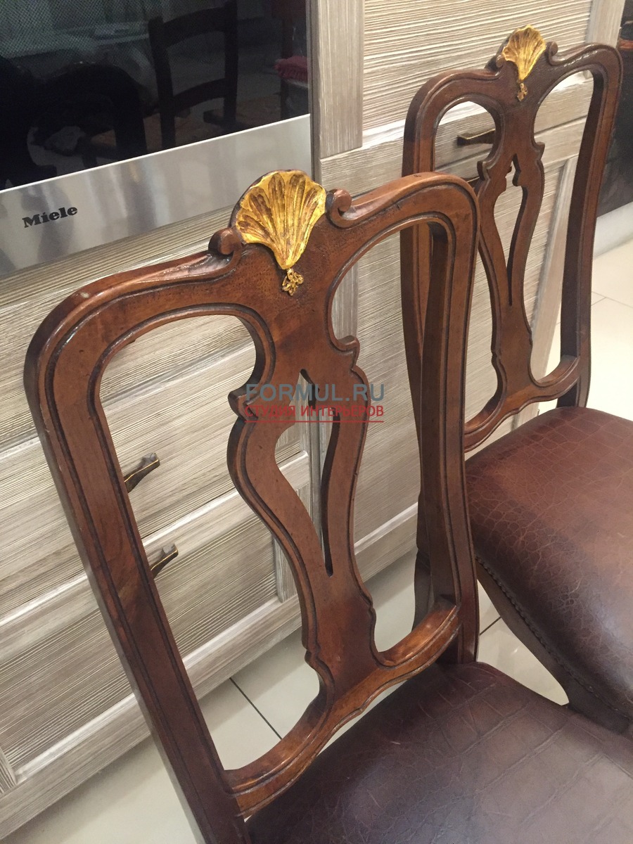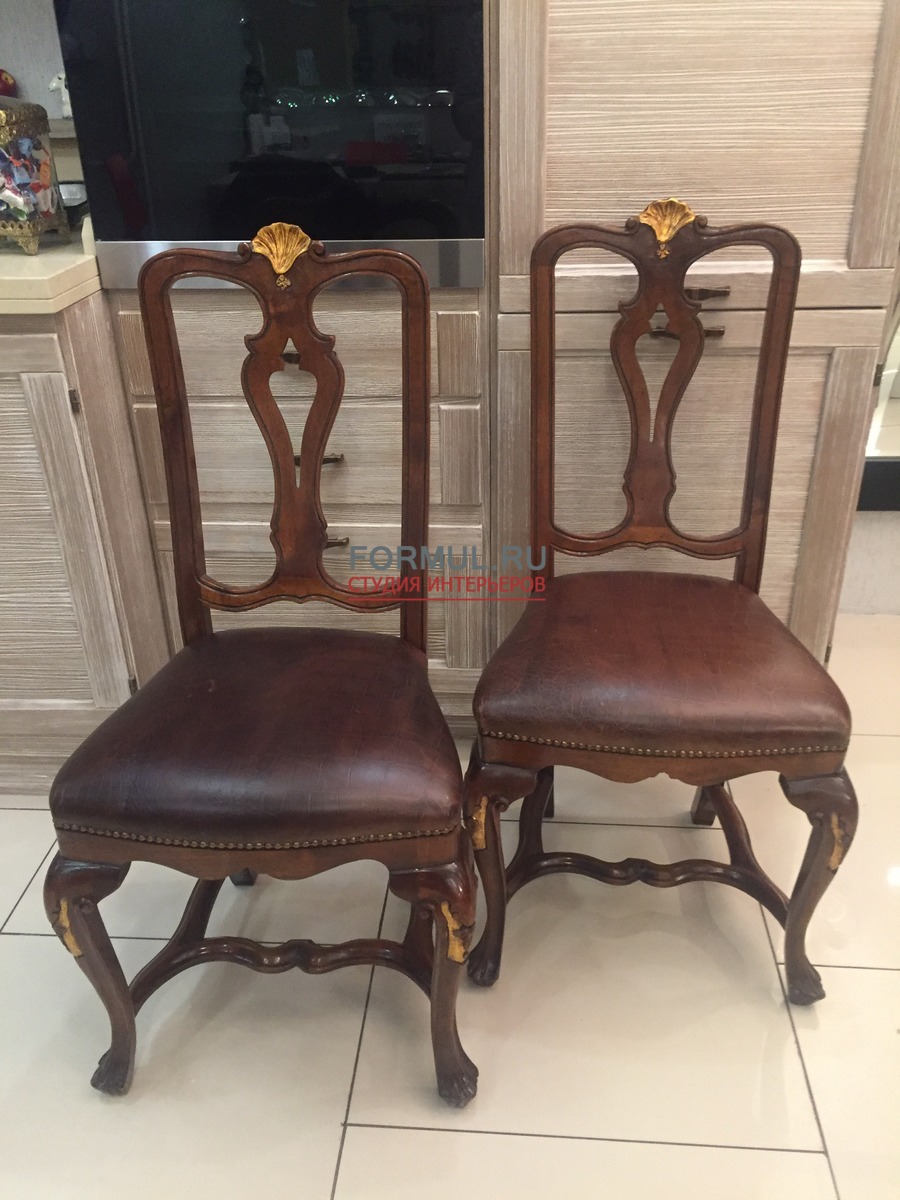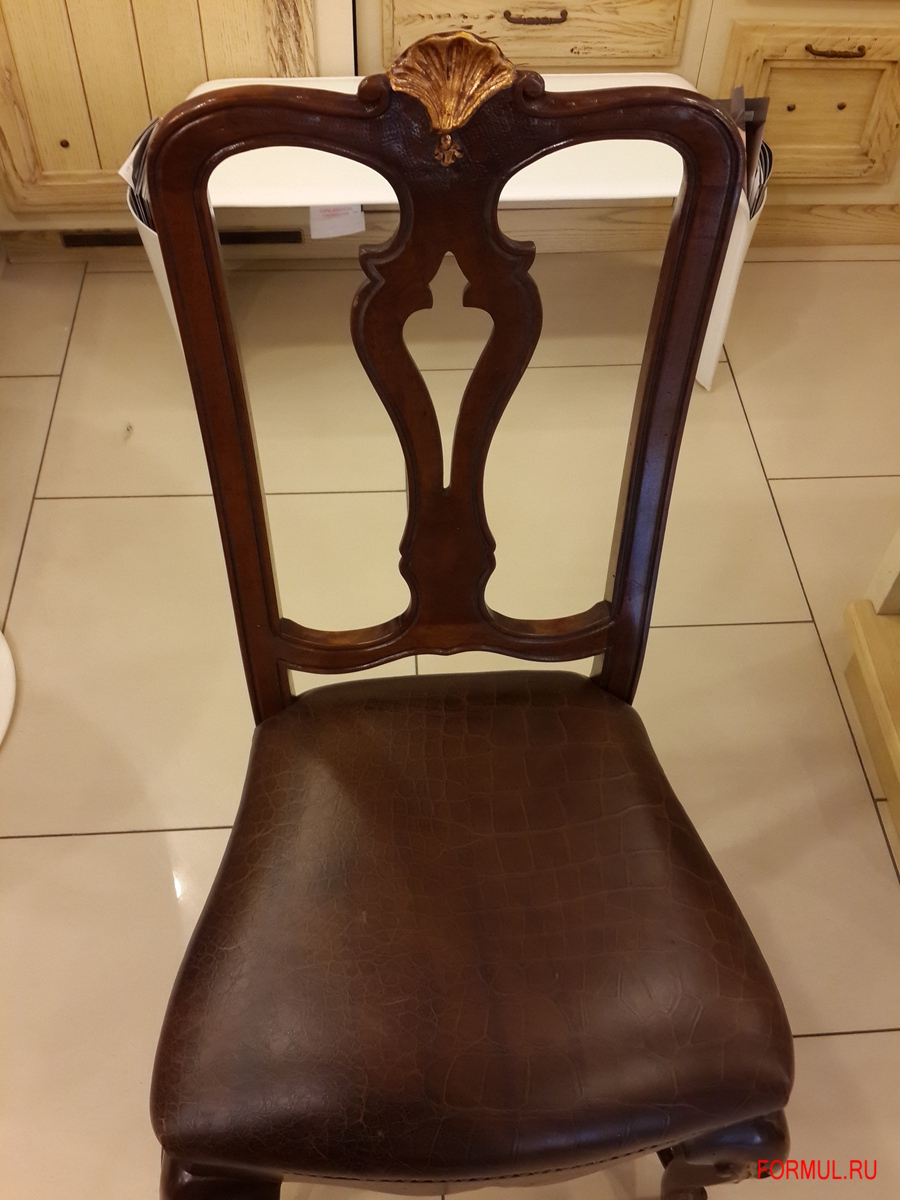 Деревянный каркас делает стулья максимально устойчивым, а также значительно продлевает срок службы. Сиденье обтянуто кожей приятного шоколадного цвета и задекорировано заклёпками с "эффектом золота", что делает мебель особо стильной и изысканной.