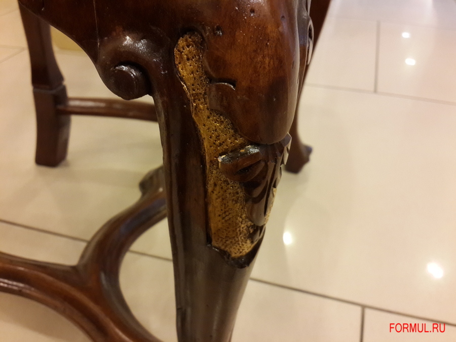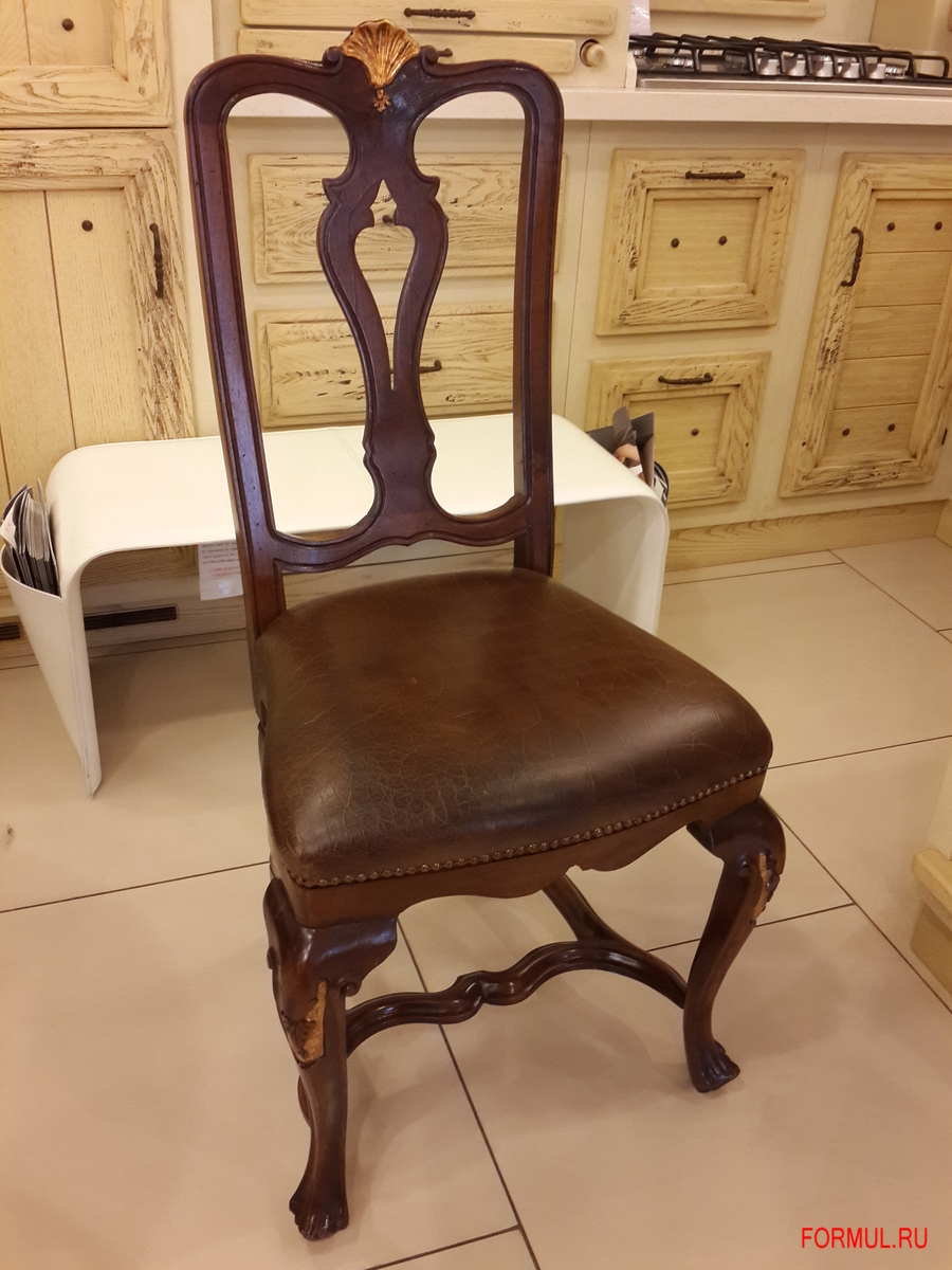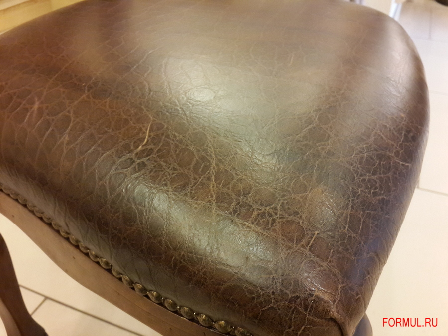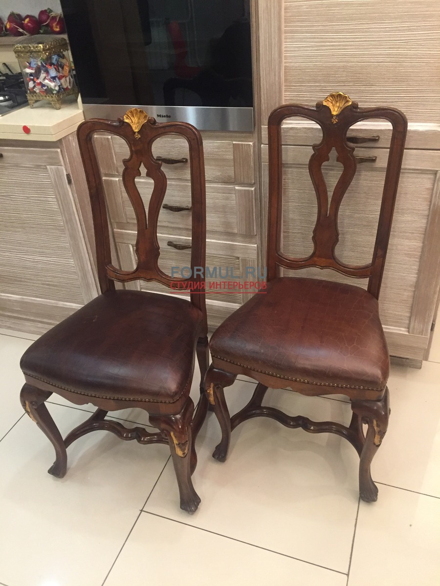 Деревянный каркас делает стулья максимально устойчивым, а также значительно продлевает срок службы. Сиденье обтянуто кожей приятного шоколадного цвета и задекорировано заклёпками с "эффектом золота", что делает мебель особо стильной и изысканной.