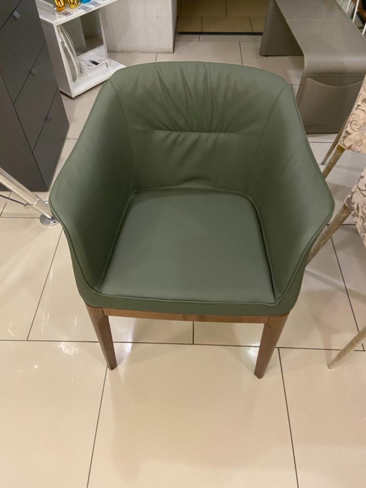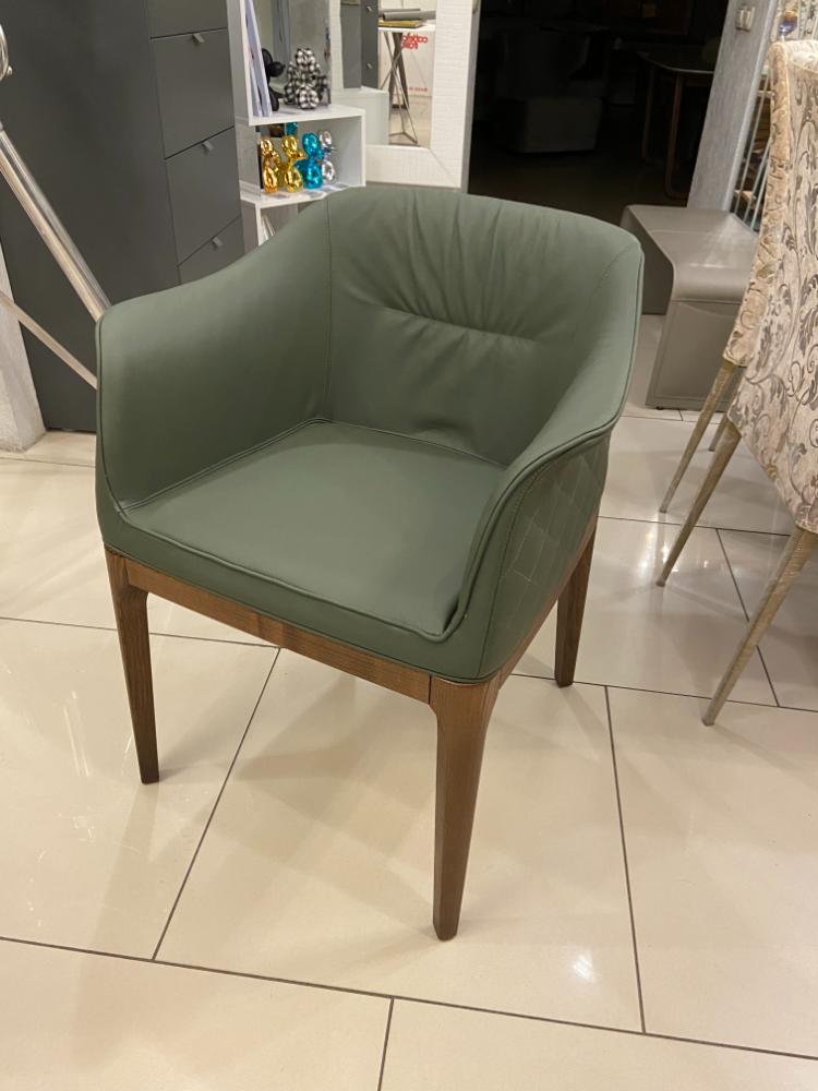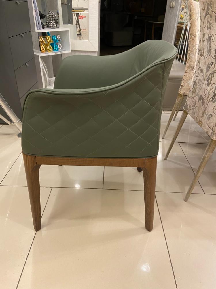 Спинка украшена строчкой. Обивка: темно-зеленая кожа (Pelle P42). Ножки из ореха каналетто (14 noce canaletto).