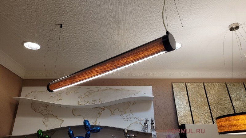Размеры: Длина подвеса, мм: от 50 до 1300 Расстояние между тросиками, мм: 1000 Примерная площадь освещения, м?: от 8 до 10 ДxШxВ: 1030x80x80 мм Вес: 2.5 кг Материалы: шпон ореха. Отделка: американский орех, кант - черный