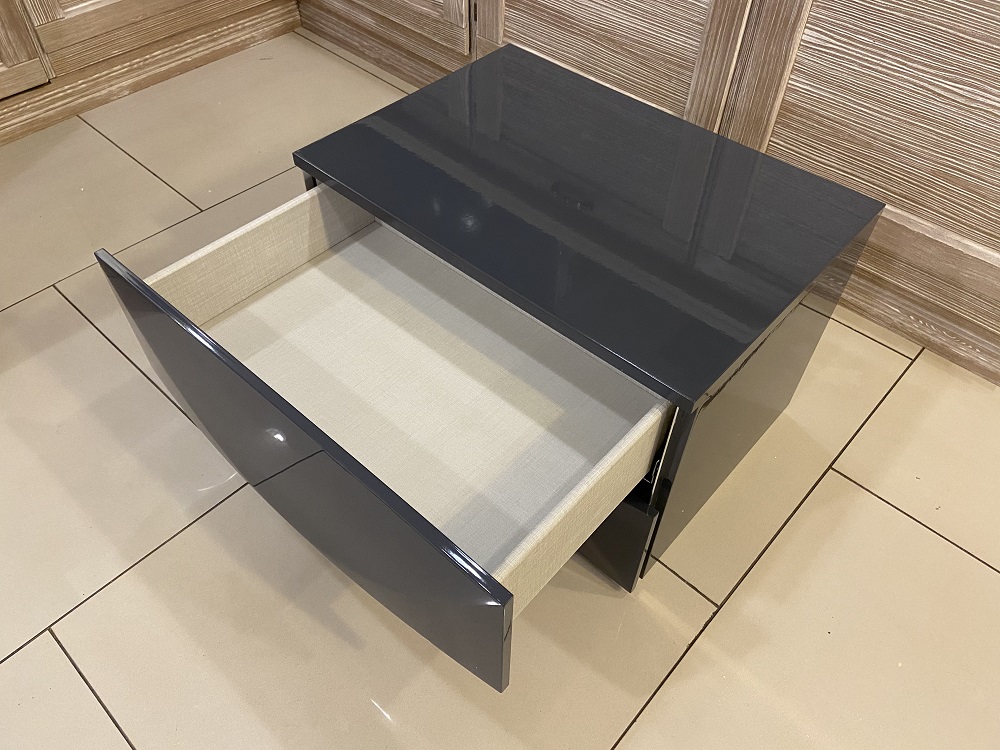 Материал, из которого создана прикроватная тумбочка — дерево, окрашенное темно-серым глянцевым лаком. Это классика с ее природными оттенками, простотой линий, натуральностью материалов. Благодаря такому исполнению тумба может стать самодостаточным акцентом на фоне остального дизайна помещения.