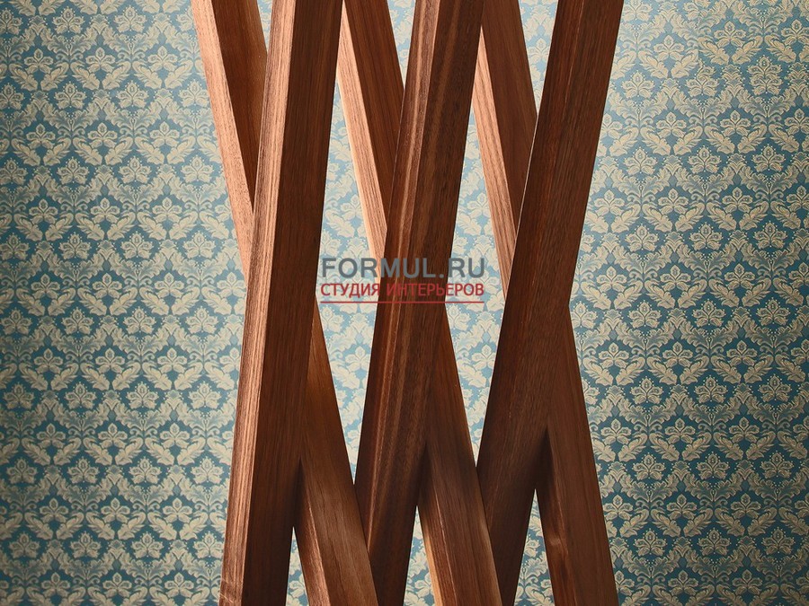 Собственно, перед нами большая буква «Х» на подставке, искусно выполненная из дерева. 6 деревянных планок (по три с каждой стороны) пересекаются между собой в определённой точке. Прикреплены планки к прямоугольнику, окрашенному в белый цвет и выполняющему функцию подставки.