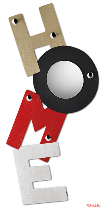 Создана из четырех ярких букв, как бы нанизанных друг на друга и сложенных в слово HOME: бежевый, черный, красный и белый с крапинками-зеркалами и с крючками для одежды. Гармонично, ярко и в современном духе.